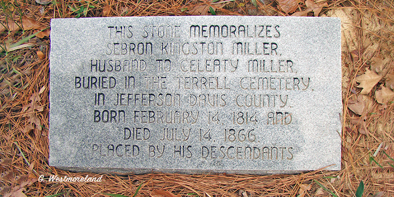 14 Feb 1814 - 14 Jul 1866 "This stone memoralizes Sebron Kingston Miller, Husband to Celeaty Miller, buried in the Terrell Cemetery in Jefferson Davis County. Placed by his dependants."
