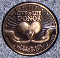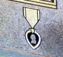 Medal, Ribbon with Heart & likeness of George Washington. - Purple Heart, a U.S. Military medal given to soldiers wounded in action.